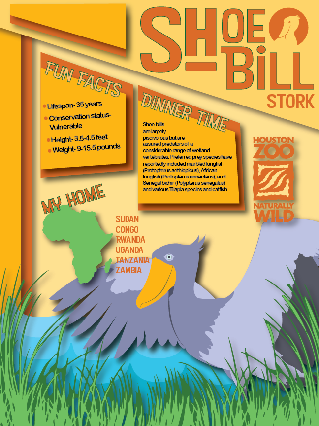In the Spring of 2023, my Introduction to Illustration course presented me with my first project: creating an informative pamphlet for a zoo, specifically using the Houston Zoo as our location. One of the project's requirements was to employ the “Pattern Tool” in Illustrator to design the pamphlet's back. I chose the Shoebill Stork, a species known for its prehistoric appearance, as the focus of my pamphlet. My design included detailed information about the Shoebill Stork's habitat, diet, and lifespan, which involved extensive research to ensure accuracy and educational value. This project not only honed my skills in using advanced design tools but also deepened my understanding of effective informational layout for public engagement.