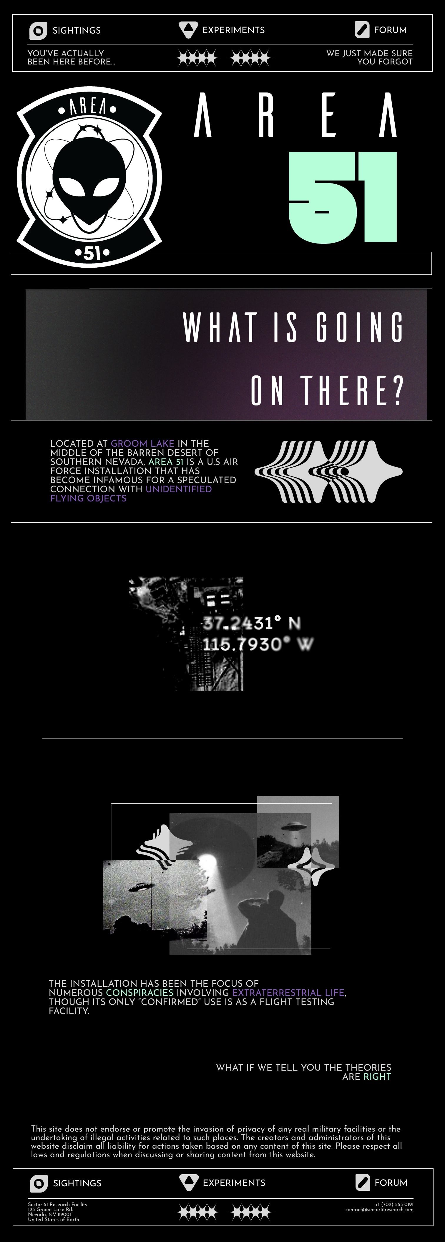 In Fall 2023, during my UI/UX Design class, I designed a fictional website for the U.S. Space Force, imagining a future where alien life is confirmed and the Space Force assumes control of Area 51 for advanced extraterrestrial research. Alongside developing the site’s interface, I created a full visual brand for Area 51, including a custom logo, color palette, and design language that balanced military precision with sci-fi intrigue. I also embedded subtle, secretive details throughout the site to reflect the base’s mysterious nature. This project allowed me to explore narrative-driven design, creative branding, and immersive user experience.