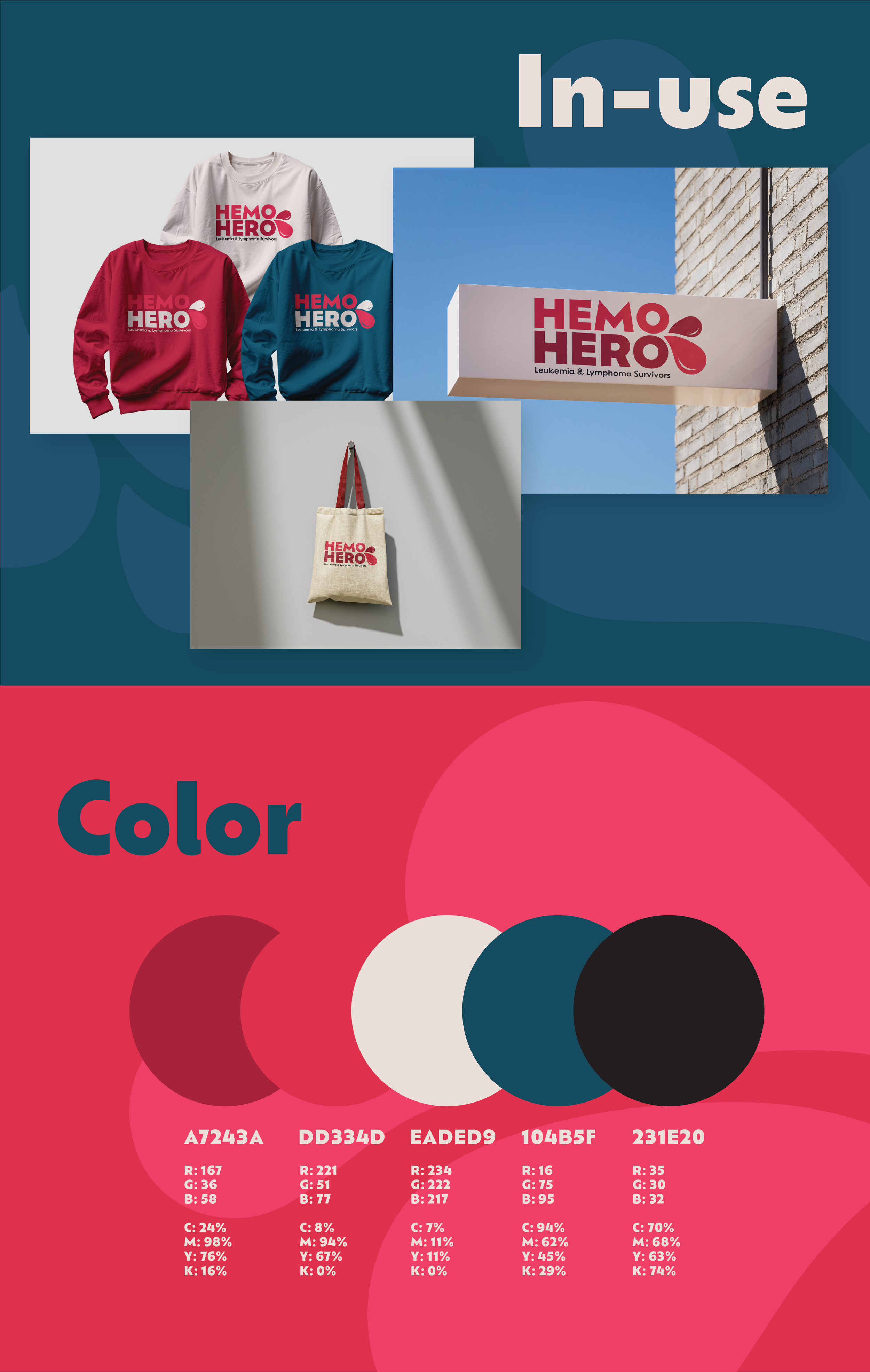 The HEMOHERO Style Guide establishes te visual identity of a brand designed to support those affected by Leukemia and Lymphoma. It combines calming, therapeutic colors with tones symbolizing illness and recovery, while bold shapes and clean typography reflect strength, clarity, and care.