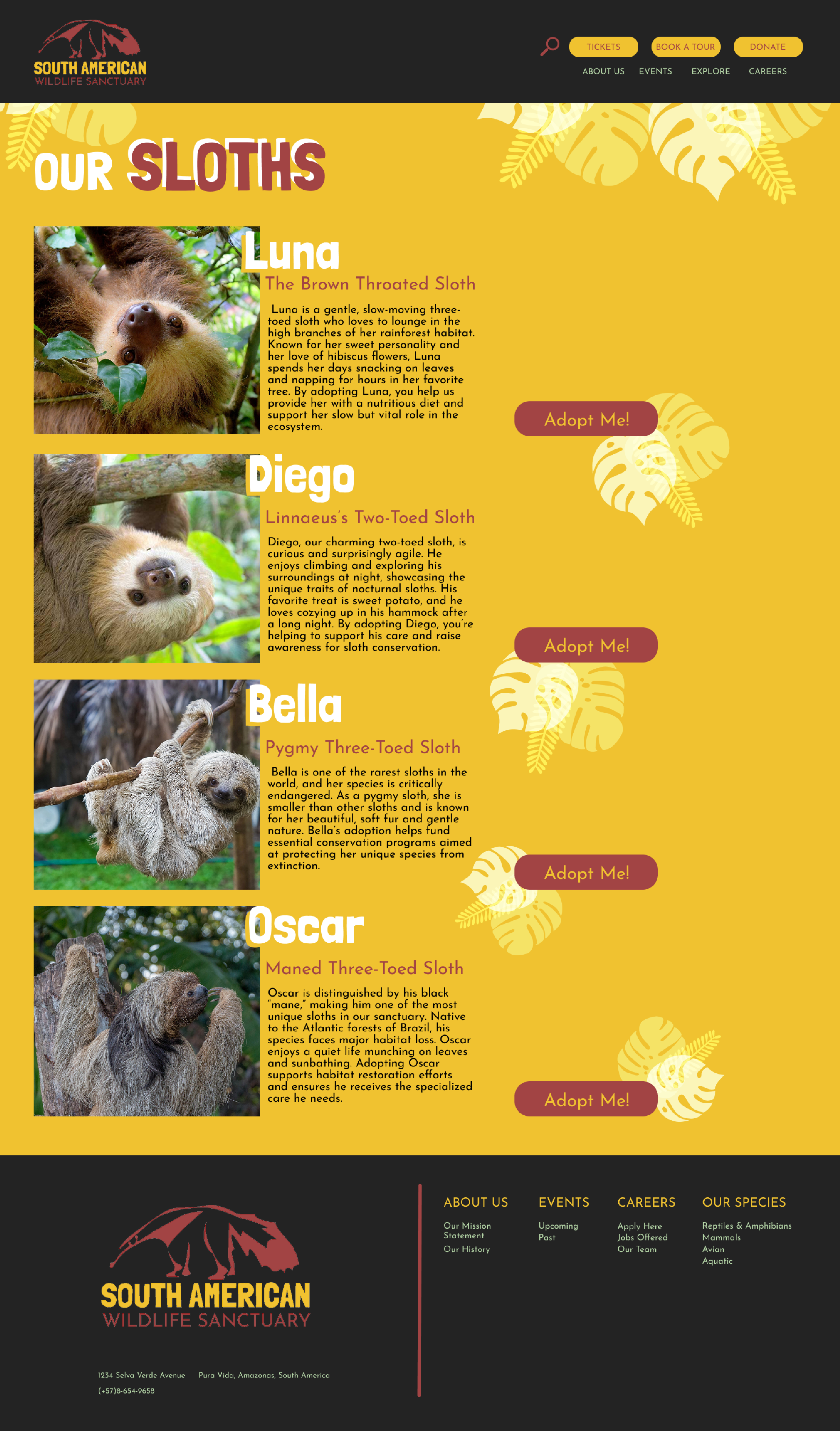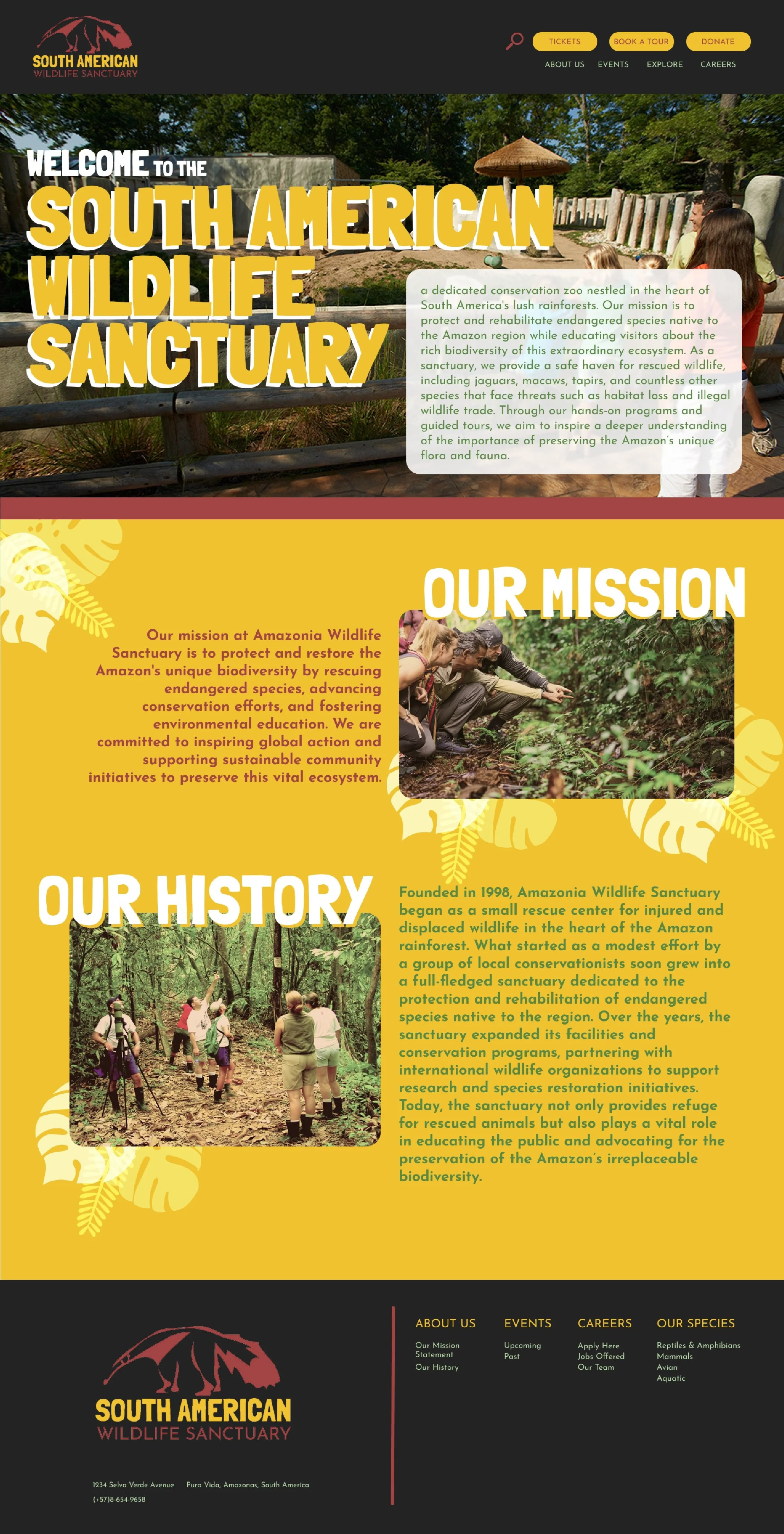 In Fall 2024, during my Graphic Design 6 class, I created a fictional zoo brand for a conservation sanctuary based in South America. I focused on species that are often overlooked but in need of greater conservation efforts, aiming to raise awareness through thoughtful design. The visual identity features earthy, nature-inspired colors and safari-style typography to evoke the region’s environment and wildlife. This project emphasized branding with purpose, combining visual storytelling with environmental advocacy.